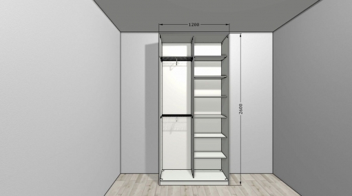 Шкаф и наполнение к нему создаётся индивидуально под каждый проект и с учётом особенностей помещения. Шаг изготовления изделий всего 1 мм! Это позволяет сделать мебель любого размера в рамках ограничения системы.