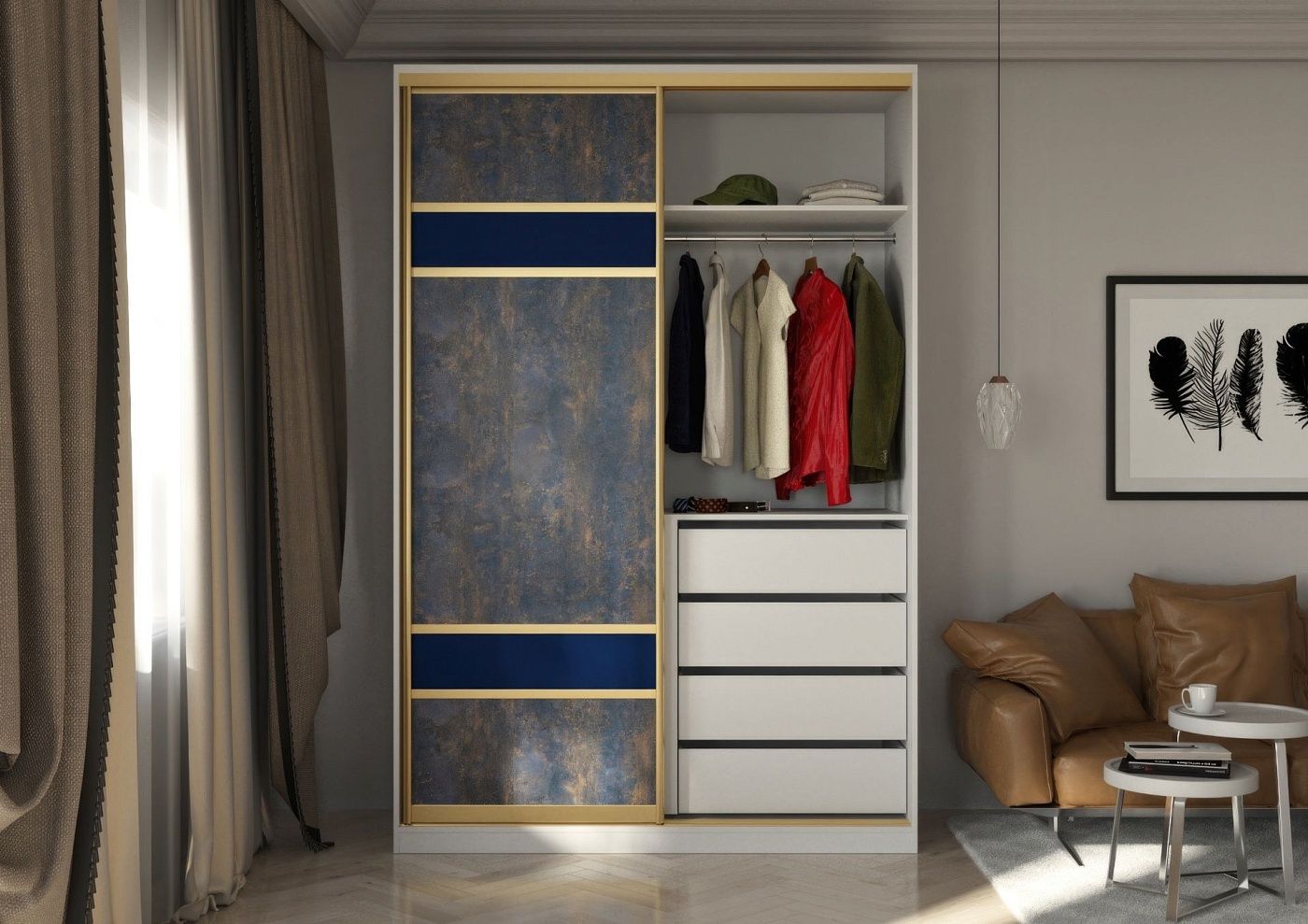 Корпусный 2-х дверный шкаф-купе в профиле «С» цвета «Золото матовое», двери-купе в цвете Альфа, а вставки – Индиго от Lamarty. Оттенок Альфа – это декор с явно выраженной индивидуальностью. Тандем оранжевых, лазурно-голубых и сизо-сиреневых тонов создаёт сочную и легкую в восприятии комбинацию.