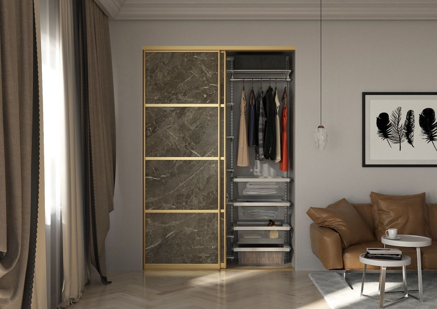 Встраиваемый шкаф-купе выполнен с использованием профиля «С» в цвете «Золото матовое», двери-купе выполнены в цвете Рускеала от Lamarty. Цвет камня Рускеала – самый последний тренд, многоцветные оттенки этого декора прекрасны в самых разных сочетаниях!