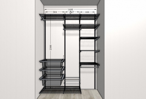 Мы предлагаем два варианта внутреннего наполнения шкафа:1. на основе гардеробной системы ARISTO – сетчатые стальные полки и корзины;2. на основе ЛДСП – полки и выдвижные ящики.