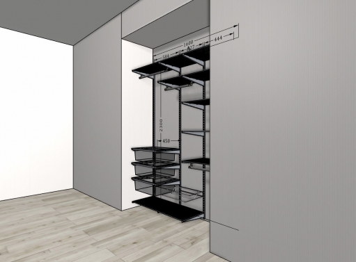 Шкаф и наполнение к нему создаётся индивидуально под каждый проект и с учётом особенностей помещения. Шаг изготовления изделий всего 1 мм! Это позволяет сделать мебель любого размера в рамках ограничения системы.