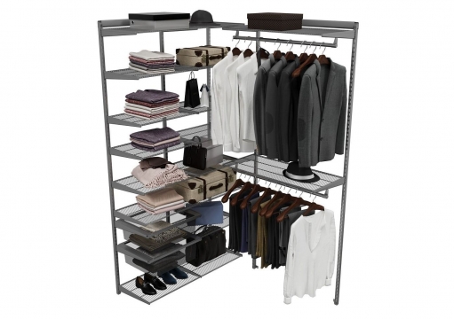 Компактная гардеробная, расположенная в глубокой нише. В гардеробной использованы сетчатые полки различной длины, выдвижные сетчатые корзины с доводчиком, штанги.