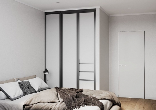 Освещение гардеробной выполняется с помощью потолочного светильника. Комфортным и элегантным решением являются складные двери из матированного стекла в обрамлении алюминиевого профиля черного цвета, без нижних направляющих.