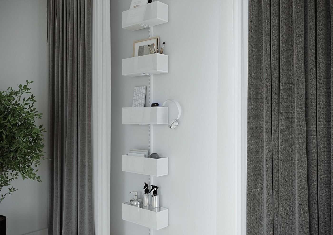 Навесные полки крепятся к стене на металлические направляющие. Установка без пыли, крепеж подбирается под материал стены на месте монтажа.