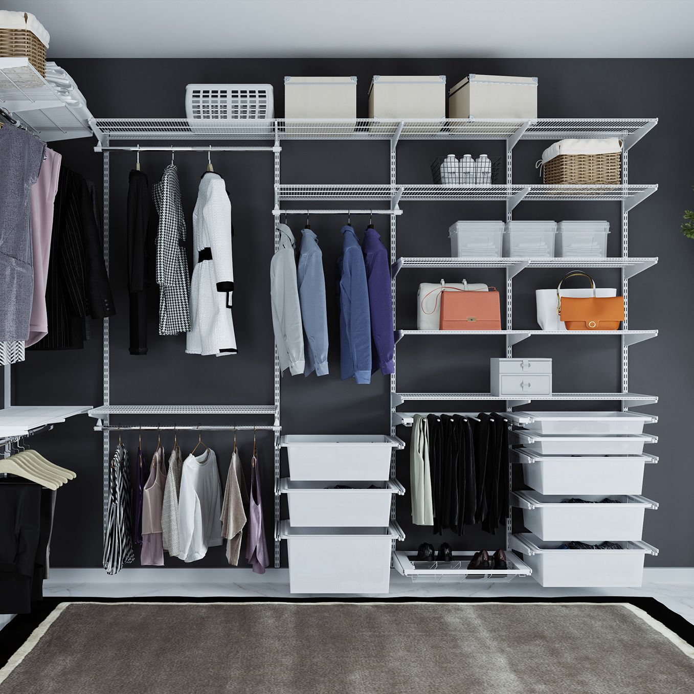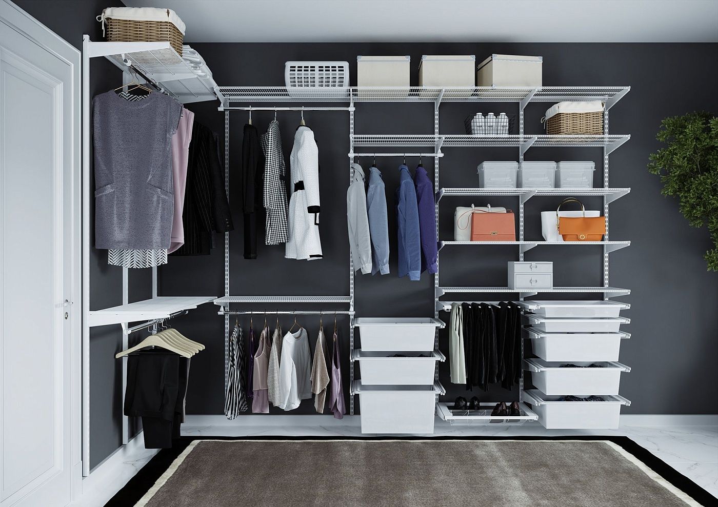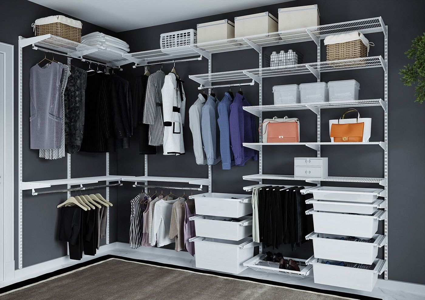 Эта вместительная угловая гардеробная для семьи отличается большим количеством выдвижных элементов с доводчиком: