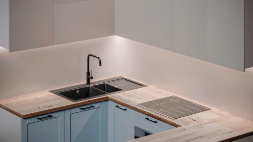 Кухня в смешанном стиле прованс и скандинавский с фрезерованными фасадами в цвете «Софт Скай» и прямыми матовыми фасадами Egger, столешница постформинг Egger. Кухня Пиана — современная интерпретация деревенской классики которая идеально впишется в любую квартиру, придаст интерьеру атмосферу свежести, спокойствия и уюта.