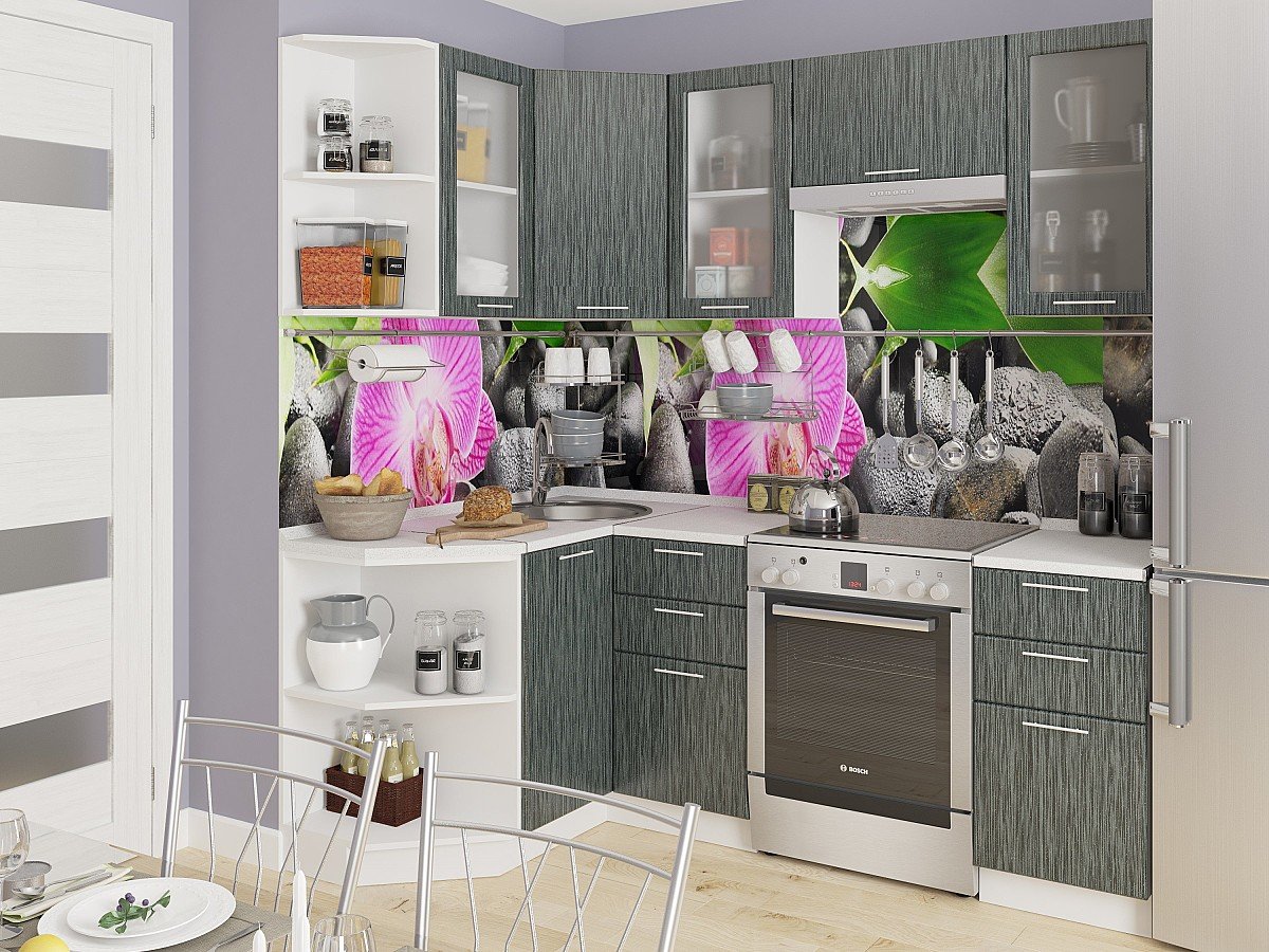 Валерия-М-04 Черный металлик дождь. Освежить и увеличить кухню можно при помощи представленного набора корпусной мебели контрастного варианта отделки. Просторное или небольшое помещение гарнитур с интересным цветовым решением прекрасно расширяет площадь и дарит интерьеру респектабельность и стиль. Такой вид обстановки не требует лишнего ухода, в отличие от чисто белого варианта. Даже самая маленькая кухня приобретет объем с нашей мебелью, оформленной с отделкой фасадов декоративными вставками из стекла. Светлая, комбинированного цвета мебель не загромождает пространство. Кажется, что помещение наполнено воздухом и новизной приятной глазу. При этом комбинировать можно разные оттенки. Белый без сомнения универсальный тон. Он гармонично сочетается с другими. Контрастные фасады и гармоничного цвета текстиль на фоне белой бытовой техники это очень красиво и оригинально.