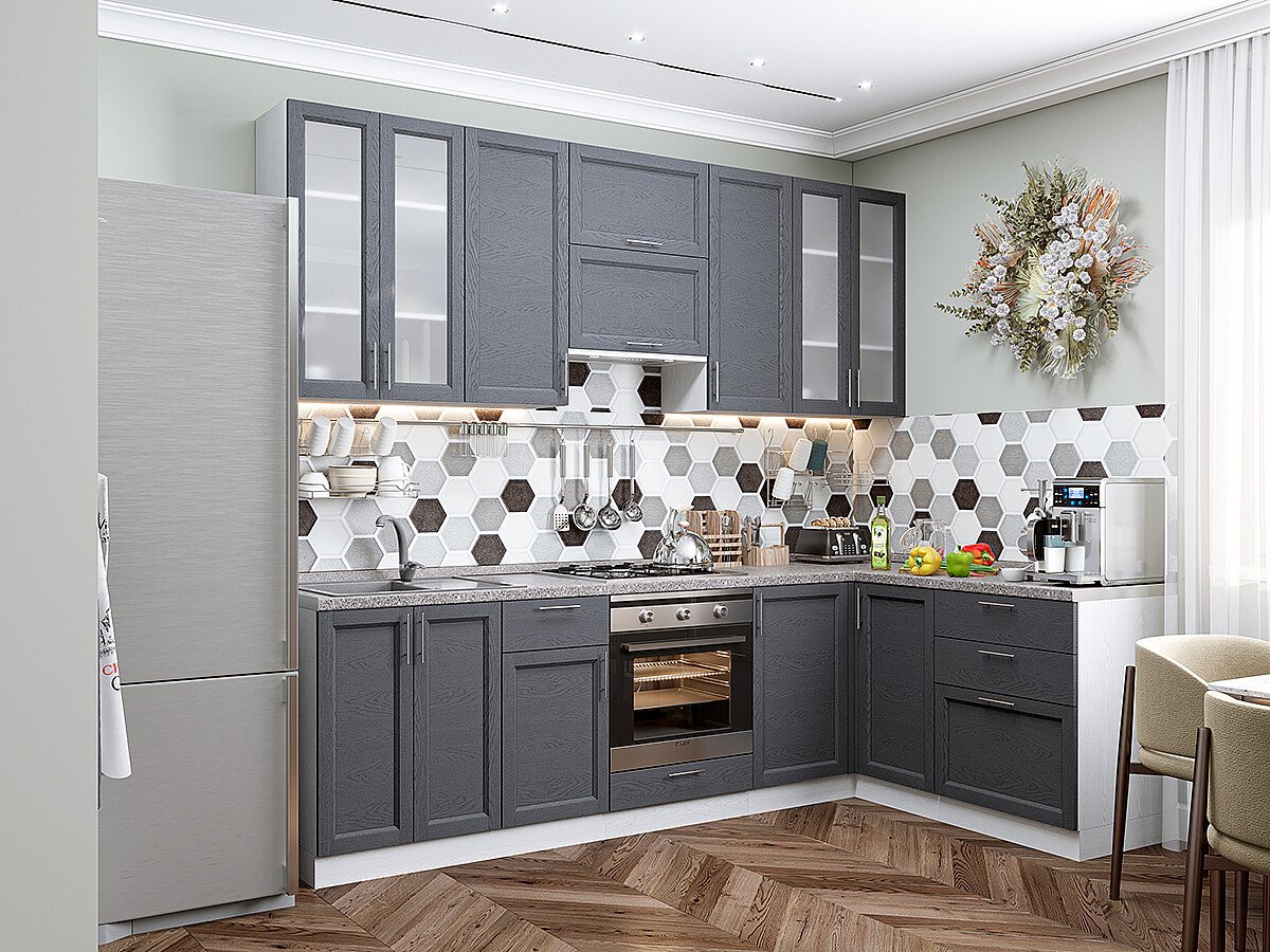 Сканди-04 Graphite Softwood. Хорошим вариантом для оригинальной кухни графитового оттенка станут столешницы под мрамор или гранит, фасады шкафчиков с филенками, украшенные декоративными вставками из прочного стекла. Такой цвет кухонного гарнитура хорошо сочетается с полированным никелем, нержавеющей сталью и гармоничного оттенка текстилем. Чтобы поддерживать идеальный порядок и чистоту, стоит периодически устраивать на кухне генеральную уборку смесью из теплой воды и жидкости для мытья посуды. После влажной уборки нужно протереть все поверхности насухо. Лучше не пользоваться царапающими губками, а заменить их на салфетки или хлопчатобумажные тряпочки. Представленный на фото кухонный гарнитур подойдет для интерьера в любом стиле от минимализма, классики и скандинавского строгого стиля до модерна или хай-тек. Шкафчики с серого тона фасадами красиво смотрятся на фоне светлых и темных стен. Здесь можно использовать цветовые яркие и гармоничные акценты для создания атмосферы уюта на кухне.