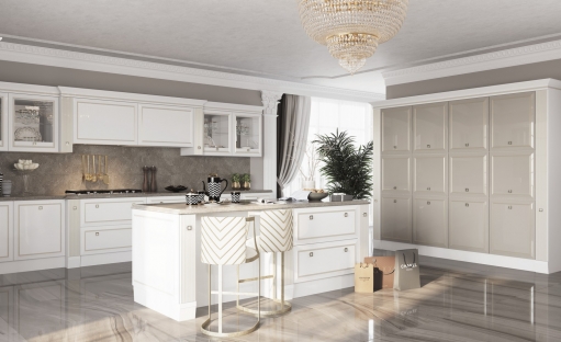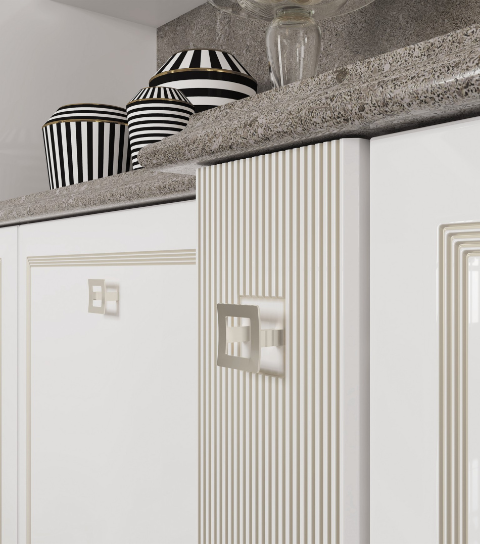 Не жертвуя роскошным дизайном, в ней все продумано до мелочей: фасады из МДФ с вогнутой поверхностью, имитирующий рамку, и декоративным фрезерованным молдингом, эргономичные поверхности и места для хранения, которые помогают оптимизировать пространство и сделать его максимально удобным для повседневного использования