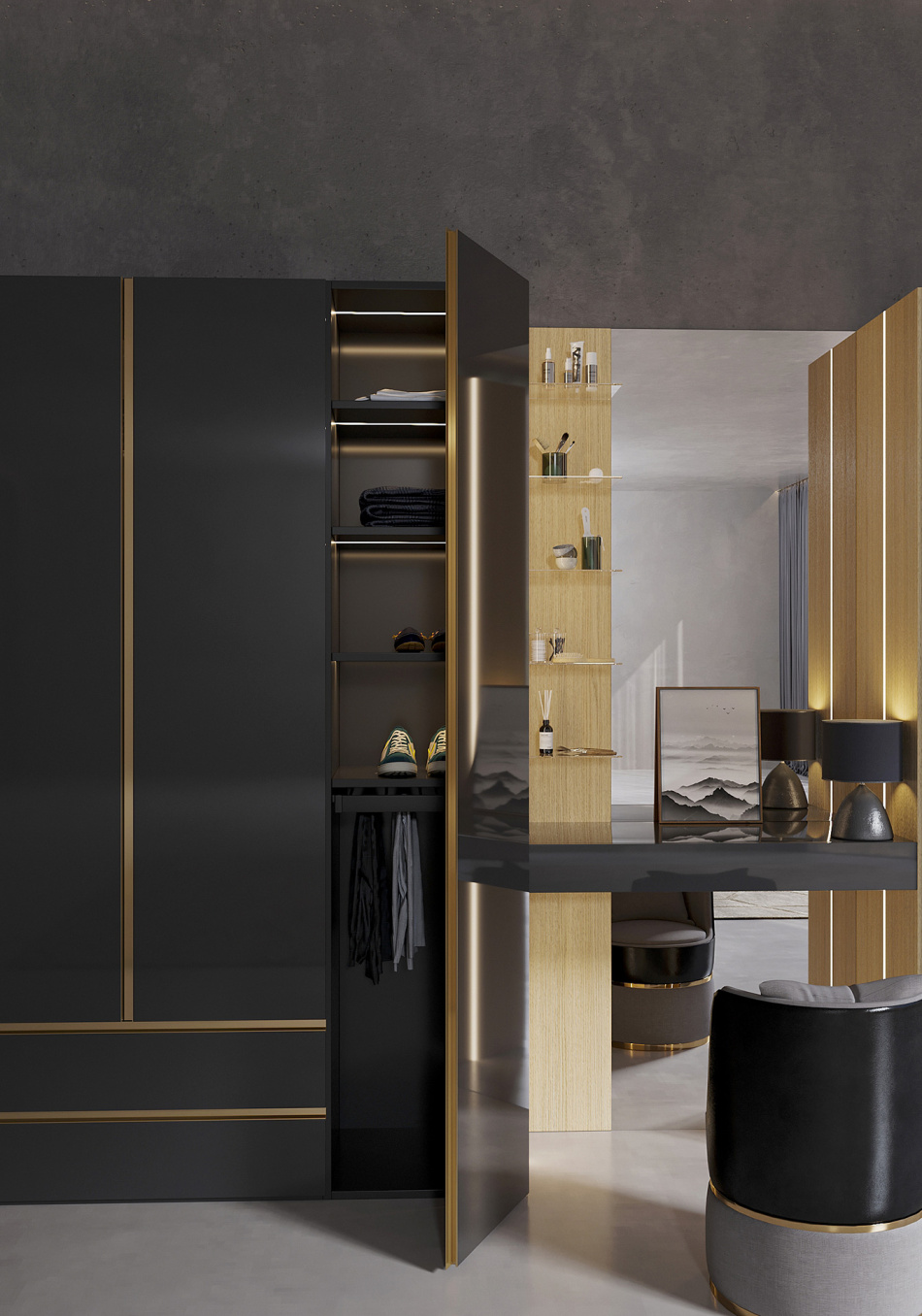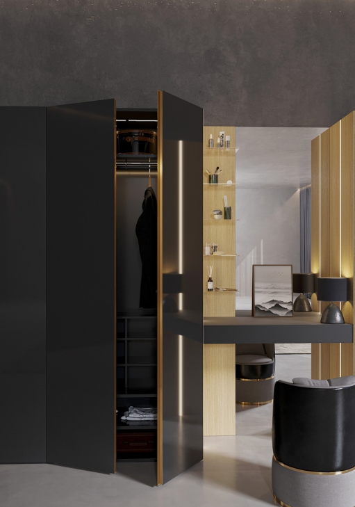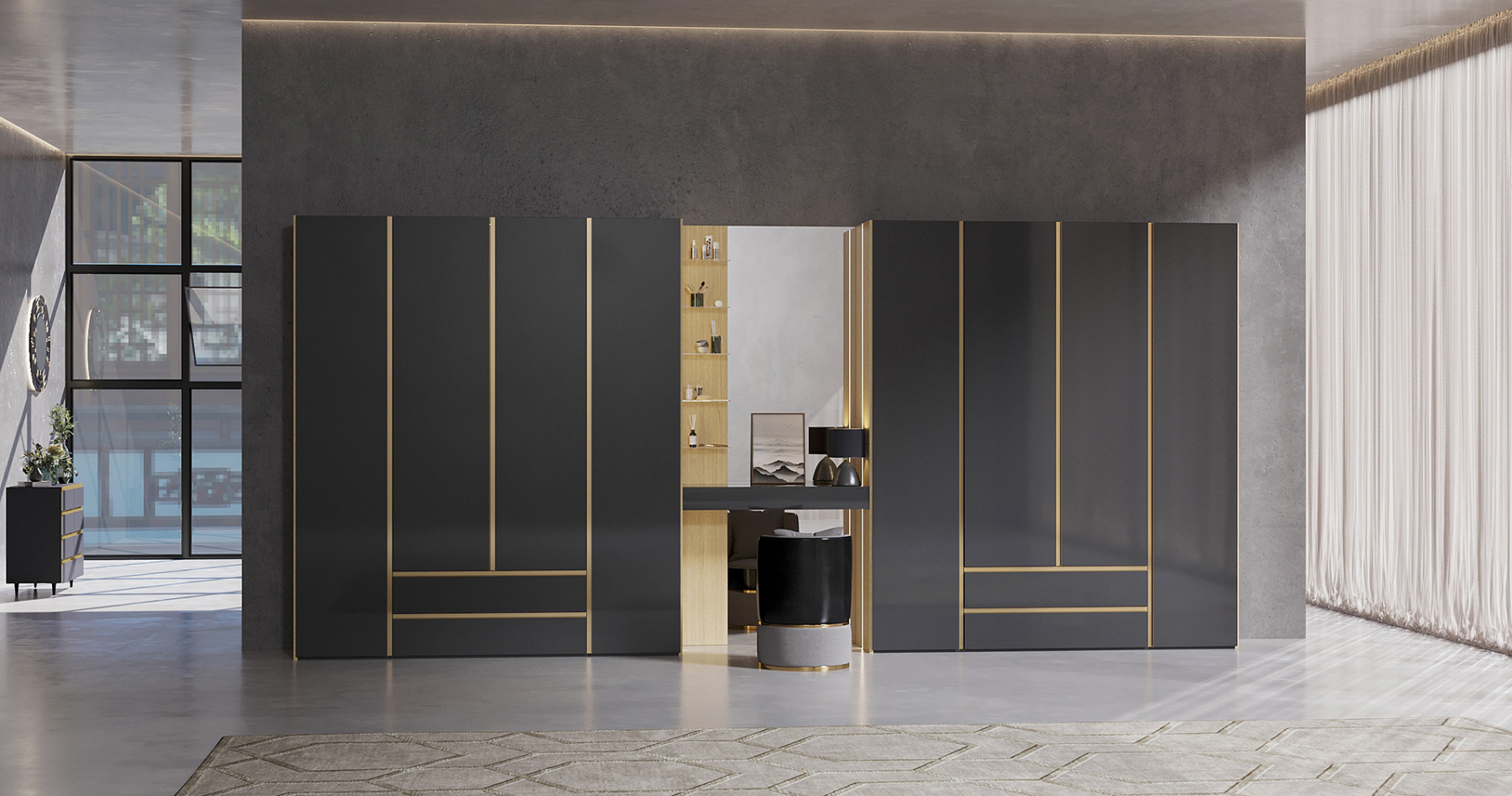 Длинные распашные двери с удобным и элегантным захватом с использованием врезной завершаю щей ручки Новара. Передовые технологии производства обеспечивают долговечность данным гардеробным.